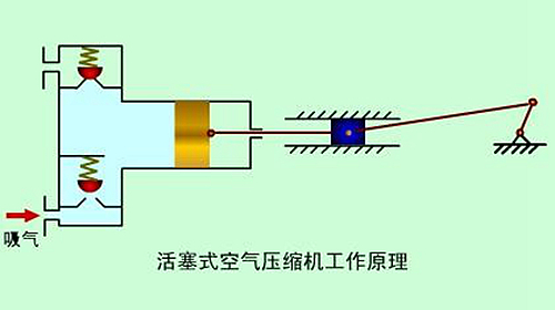 活塞式空氣壓縮機的工作原理:活塞式空壓機在氣缸內作往復運動的活塞向右移動時,氣缸內活塞左腔的壓力低于大氣壓力,吸氣閥開啟,外界空氣吸入缸內,這個過程稱為壓縮過程。當缸內壓力高于輸出空氣管道內壓力后,排氣閥打開?;钊耐鶑瓦\動是由電動機帶動的曲柄滑塊機構形成的。曲柄的旋運動轉換為滑動--活塞的往復運動。這種結構的壓縮機在排氣過程結束時總有剩余容積存在。在下一次吸氣時,剩余容積內的壓縮空氣會膨脹,從而減少了吸入的空氣量,降低了效率,增加了壓縮功。